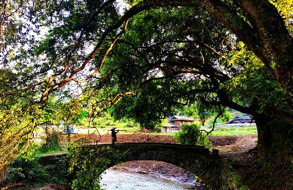 水口小橋流水,古樹(shù)蓊郁。村子打開(kāi)山門(mén),山風(fēng)整裝待發(fā),夏天不遠(yuǎn)了。茂盛的地脈樹(shù)下,都能看到傘的影子。