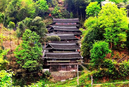 一眼的山,一眼的綠,一眼的云霧,一眼的煙雨,從吊腳樓木格花窗亮麗妖嬈走出來(lái)。經(jīng)過(guò)吊腳樓的旅人,不經(jīng)意就會(huì)站成一棵長(zhǎng)腳的樹(shù)。