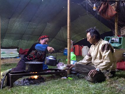 悄然而至的晨曦,隱藏著太古未盡消遁的光芒。揚(yáng)天的旌旗纏成不倒的箭桿,曾經(jīng)的故事還沒走出夢(mèng)中。草原的安謐,輕輕地?fù)嵛恐届o的牛群。奶香已浸漫晨的清新中,擠奶的姑娘臉頰已鍍上了紅霞的光暈。天地間的沉靜,只等待著第一聲牛哞的響起……草原的清晨,朝陽光臨的一刻,酥油和奶汁的淳香會(huì)醉倒那一片草色碧透的天地。