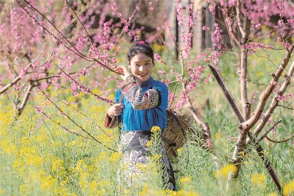 抬望眼,坡上繁花似錦,余暉里,若粉色華蓋覆于坡上,若云若霞。桃林置身峽谷之中,粉面朝天,明艷非凡,宛如閨秀;人家坐落山麓之上,披煙戴云,絕食煙火,疑為仙廬;山溪清卷碧波而去,棲云而眠,漱石而歌,響似佩環(huán)。橘色棧道蜿蜒而上,桃花林里若隱若現(xiàn)棧道間著漢服者,或留倩影,或嗅花香;拾級(jí)而上,又見(jiàn)客家姑娘,身著藍(lán)底配黑褂,綴以白色圖案,提籃摘豆,俯身拾花,別在耳鬢遠(yuǎn)望,若畫(huà)中紅印印在發(fā)間,身后白色梨花綠色葉。
