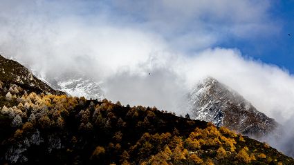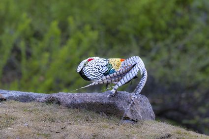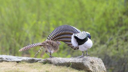 4月16日,筆者在康定市雅拉鄉(xiāng)境內(nèi),再次拍攝到國家二級保護動物白腹錦雞求偶的清晰視頻。一只色彩斑斕的雄鳥,拖著黑白相間的云狀斑紋尾羽,圍著雌鳥跳起了“圓舞曲”。整個求偶過程有十多分鐘。每年三至五月是白腹錦雞求偶期。