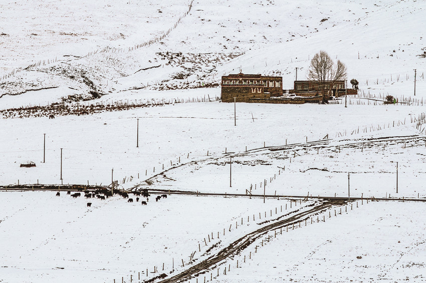 雪后的高原,藍(lán)天白云,大地和連綿到天邊的遠(yuǎn)山,就像被什么過濾了一樣,一片潔白,滿眼凈是純凈的美,全然沒有冬日的荒涼,更顯空靈、大氣,盡顯高原獨(dú)特的美。白雪覆蓋的村莊、牧場被河流、大路小徑串連起來,寧靜、秀美,像一幅幅天然的水墨畫,美不勝收。