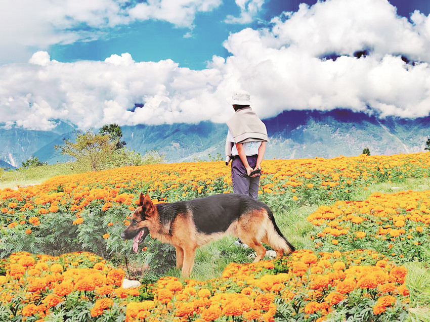 在這金風送爽的秋日,瀘定德威加郡海子村18萬株萬壽菊競相綻放,漫步在花海之中,人們可以感受秋風的輕撫,呼吸清新的空氣,寧靜的村寨依托著貢嘎雪山、藍天白云,在成片的萬壽菊裝點下構(gòu)成了一幅亮麗的鄉(xiāng)村畫卷。