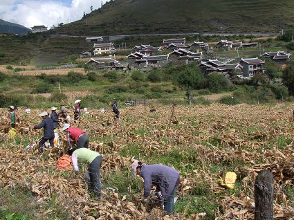 這是一個豐收的季節(jié),這是一個農(nóng)人們充滿歡聲笑語的季節(jié)。10月8日,記者走進九龍縣呷爾鎮(zhèn)華丘村,看到面貌一新的藏寨掩映在成片的玉米地里,正是收獲玉米的季節(jié),鄰里相幫,大家在密密匝匝的玉米地里收獲玉米,農(nóng)人們在玉米地里簡單午餐,談笑風(fēng)生,議論今年的收成,擺談如何調(diào)結(jié)構(gòu)增加收入,說家長里短,既有勞作的辛苦,又有鄰里團結(jié)的深厚情誼。放眼望去,漂亮的藏寨、忙碌的人群,組成一組人與自然和諧的山村風(fēng)景畫。(記者 田杰 馬建華 攝影報道)