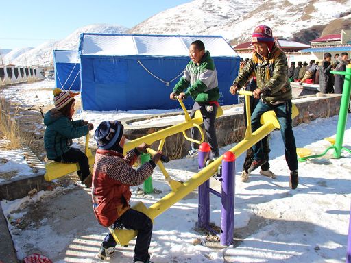 陽光普照在江巴村活動(dòng)中心,積雪還未完全融化,室外仍然寒氣逼人。6歲的卓呷同伙伴們一邊在活動(dòng)室外玩健身器材,一邊等待哥哥姐姐們的文藝演出。
