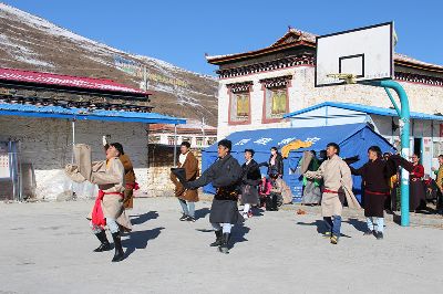 春節(jié)和藏歷新年期間,康定縣塔公鎮(zhèn)江巴村的寧靜被孩子們的歌舞聲打破了,災(zāi)后的首個(gè)寒假,孩子們回到了父母身邊,一起跳起了歡快的鍋莊,表演豐富多彩的文藝節(jié)目。