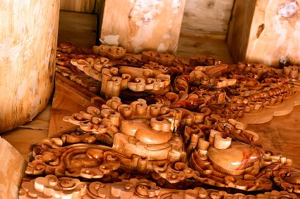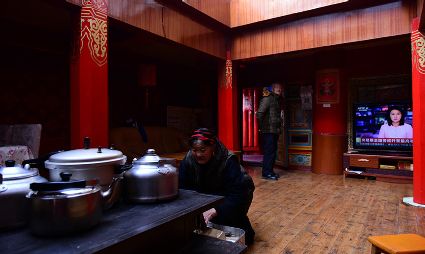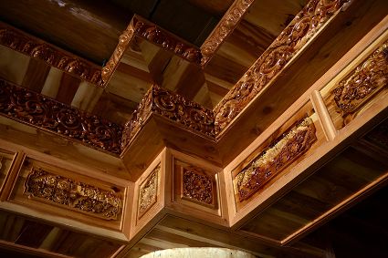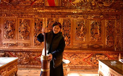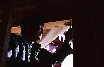 道孚民居的精華在其內(nèi)部,木材是其唯一的內(nèi)部裝飾材料,而裝飾,是一項(xiàng)繁瑣得曠日持久的藝術(shù)勞作,往往建房只需一兩個(gè)月,內(nèi)部裝飾則要幾年甚至幾十年。民間建筑藝術(shù)家們沉醉在細(xì)致入微的勞作里,讓每一個(gè)圖案都盈溢一份心底的吉祥,讓每一筆描摹都傳遞一份動(dòng)人的傳說(shuō)。房間四壁、房門(mén)和梁柱上一般都繪滿了精致典型的藏式壁畫(huà),窗上分別雕刻著龍、鳳、仙鶴、麒麟等吉祥圖案。每間屋的大門(mén)上都鑲嵌醒目的兩個(gè)獅頭大銅環(huán),凸顯了與之相融的漢文化的特點(diǎn)。置身其間,色彩斑斕中,身邊盡是龍飛鳳舞,鶴翔麟躍。繽紛中細(xì)端詳,真是藏民族藝術(shù)的天堂!