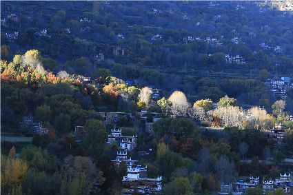 落日將最后一道霞光在山尖劃過,暗夜便裹挾這寒意搖動(dòng)起山林中的樹木。風(fēng)漸緊,那已經(jīng)稀稀落落的樹葉隨著風(fēng)的韻律,跳起歡快的鍋莊,仿佛在告別這一年的繁華。突如其來的大雪,給丹巴的二月涂上白色的記號。從山尖到院前的樹上,一溜兒雪白,正應(yīng)了“忽如一夜春風(fēng)來,千樹萬樹梨花開”的情景,讓人忍不住伸出手指看看這花是真是假。大雪過后,陽光如約而至撒滿藏寨,金色陽光和蒸騰的白霧縈繞在雪白的山頭,與山下的古碉藏寨,河畔的清流巧妙地構(gòu)成一幅絕美畫卷,讓人仿佛身處仙境。吸足了養(yǎng)分的柳樹終于抽出綠芽送來春天的信號,那柳條兒在細(xì)風(fēng)吹拂下宛如少女對鏡梳妝,在陽光下顯得無比溫柔,讓人不禁想貼近它們,感受這溫暖又靜謐的溫柔。