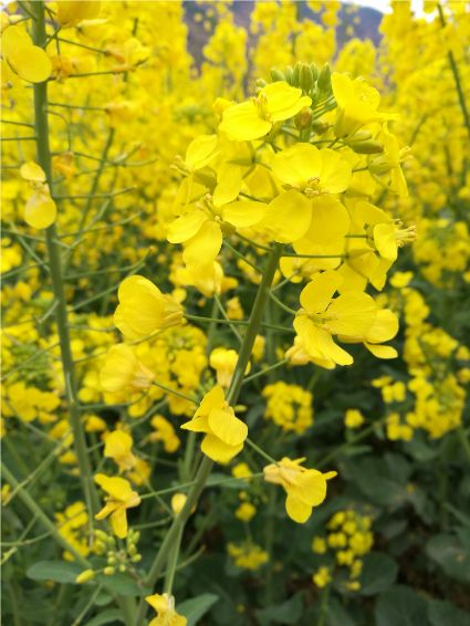 油菜花是我兒時(shí)的記憶,外婆為了生計(jì),總會(huì)在家門(mén)口的幾畝菜地里滿(mǎn)滿(mǎn)當(dāng)當(dāng)?shù)姆N上油菜,菜花開(kāi)的時(shí)候,我就會(huì)端上一根長(zhǎng)板凳、一根方板凳坐在油菜花前寫(xiě)作業(yè),油菜花的清香伴我度過(guò)了整個(gè)童年。記得兒時(shí),每逢春季,田野里都會(huì)被一簇一簇的油菜花裝扮的金黃,大片的花兒披著一層金裝,偶爾一陣清風(fēng),大地上便掀起了片片的漣漪,烈陽(yáng)下金光燦燦,甚是好看!