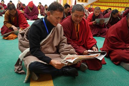 在贈(zèng)科鄉(xiāng)扎西壩子,卡熱寺、達(dá)依寺、祖元寺、打莫寺、邦忠寺等不同教派的寺廟僧人和附近的村民齊聚一堂,聆聽(tīng)十九大精神宣講。
