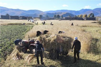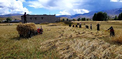 “我們要利用這段晴好的季節(jié),抓緊收割?!痹趶V袤的原野,村民們開鐮收割青稞,一輛輛滿載成捆青稞的拖拉機(jī)在田間和鄉(xiāng)村小道上歡快地疾馳。