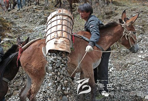 每天早上6點(diǎn)多,王玉海和同伴趕著騾子隊(duì),從白玉縣縣城旁邊的住地步行約1小時(shí)到達(dá)德沙村,約8開(kāi)始從離索道橋約300米的路邊沙石場(chǎng)裝運(yùn)碎石。他們通常工作到下午5點(diǎn),每只騾子在海拔3000米左右的高度,來(lái)回運(yùn)送20次左右,每只騾子運(yùn)輸碎石大約在3000公斤左右。這些騾子正當(dāng)強(qiáng)壯年,年齡大約在三四歲,通常在坡度在30度以下的,最大負(fù)重約800斤。