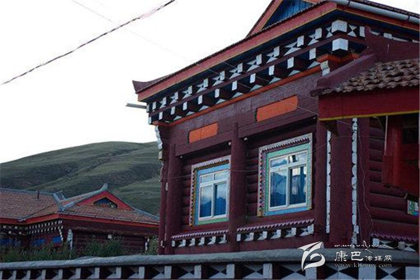 道孚民居的一般結(jié)構(gòu)是以藏式木架穿逗,作為整體骨架,一般為二、三層;以片石或泥土砌墻,按正方形各邊7-10尺為空間立柱,四柱之間稱一空,一般房屋有16-30空,也有40、50空的。柱與柱之間有穿枋或原木鎖拉扯,其余維護(hù)結(jié)構(gòu)由橫向平置,圓弧朝外的對剖圓木組成,它們層層重疊、四角交叉相搭,房頂高約5至8米。比起改進(jìn)前,柱子直徑普遍加大,豪宅的柱子需兩人合圍,給人一種穩(wěn)重之感;底層和二層的木柱連體,并仿照內(nèi)地建筑的木穿逗式結(jié)構(gòu),梁柱接榫,形成一個牢固的整體,以增強(qiáng)抗震能力。外形多為四方形,二樓呈L形、凹形或回形,內(nèi)層結(jié)構(gòu)是純木材,架“棒柯”或“棒勒”,間隔為各種用途的房間。房間上裝木望板,下鋪木地板,頂蓋用樺樹皮或硬雜木條墊底再鋪“阿嘎土”,日曬雨淋絕不漏水。屋架門窗外表的裸露部分,則多以油漆或自制的有色土染過,既防腐防蛀,又美觀大方。從外部看,二層平臺的女兒墻上,種滿了各種花草,房前屋后還種植了果樹。用泥土夯筑的底層和二層后方的土墻刷成白色,而木質(zhì)的半圓木墻體涂成褐紅色,窗框和窗扇均作彩繪,室內(nèi)裝飾也都用紅色等“火熱”的基調(diào)。各種色彩相互協(xié)調(diào)映襯,給人的印象特別深刻。