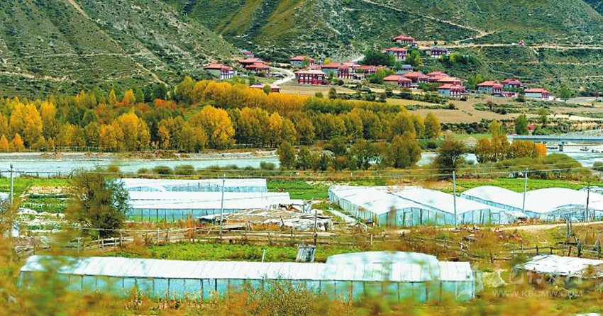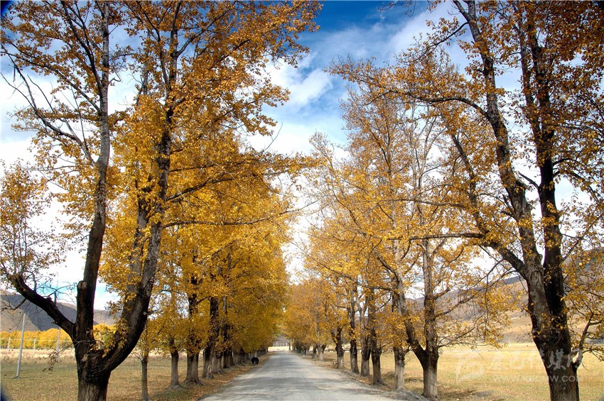 一條淺淺的小河與公路相依相偎地蜿蜒流淌,房前路旁一棵棵挺拔的白楊在秋風(fēng)秋陽(yáng)中炫耀著特有的金黃。遠(yuǎn)處的山脊,舒緩地在天幕上劃出一道道優(yōu)美的弧線。滿眼藍(lán)色、白色、金黃、黑色、綠色的飽和色塊,在明麗的秋陽(yáng)光線的描繪中,凸現(xiàn)著流暢的色彩和線條,恍如置身畫中。