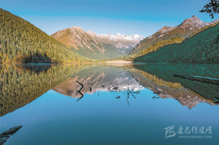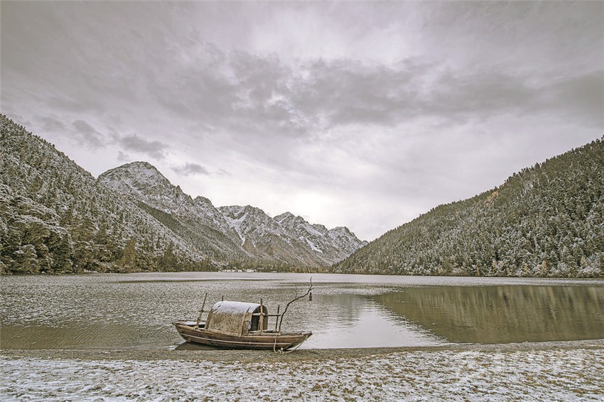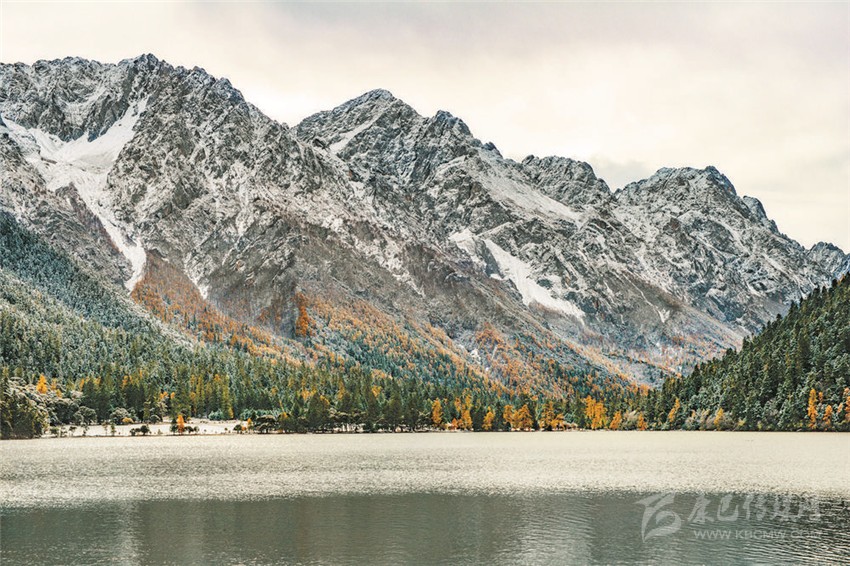 伍須海的色彩,四季都會變化,秋天最為精彩,滿湖的深綠,青黛的暗針葉林,金黃色的紅杉,火紅的槭樹,褐色的高山櫟,以及點綴于其間的沙棘果實,都五彩繽紛地點染著這張“畫布”。
