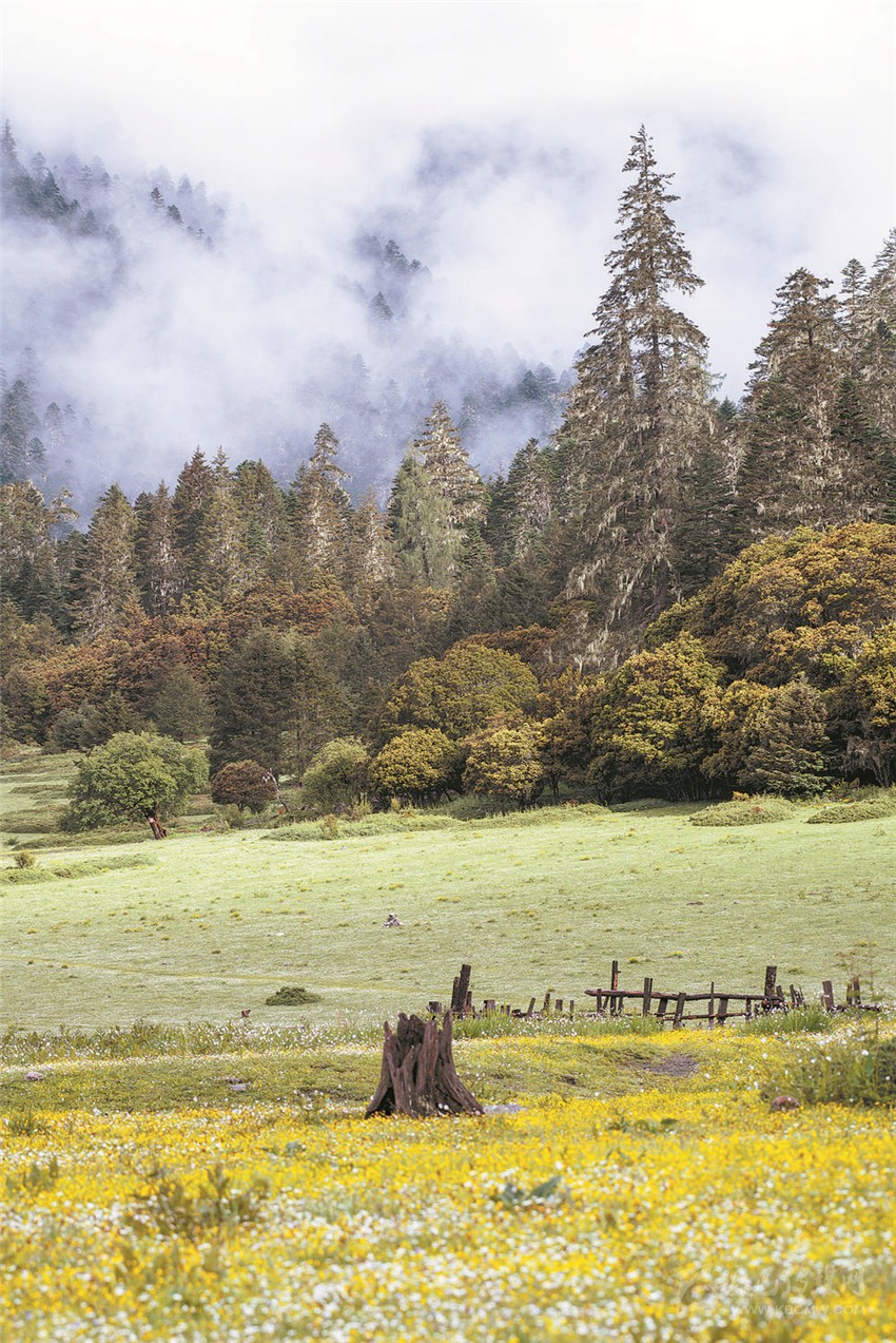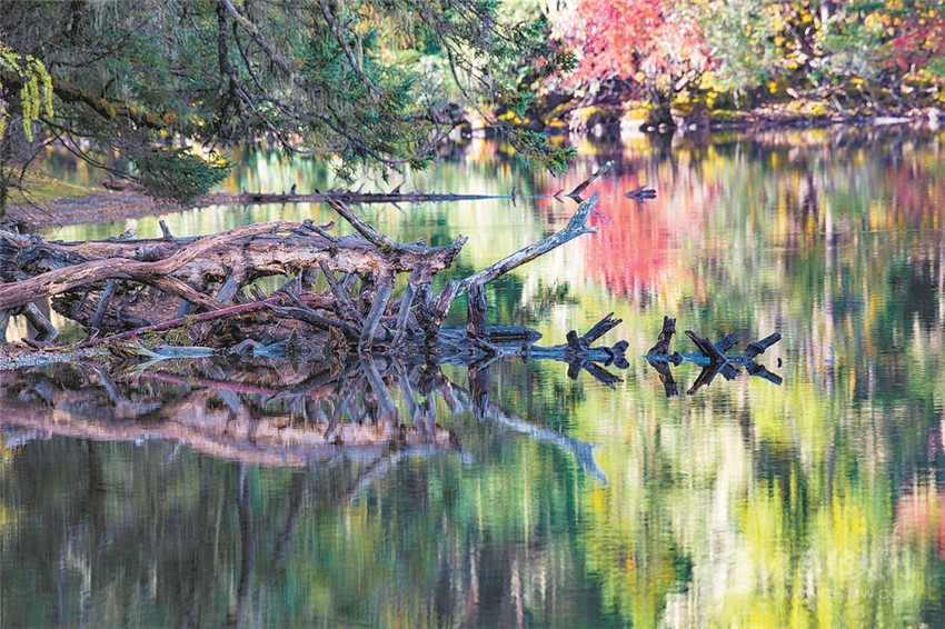 “江”與“湖”,靜臥于原始森林與草甸花海的之間,河溪清澈,湖水湛藍,真如秘密花園,人間仙境。湖畔最美的是盤根錯節(jié)的老柏樹,枝條彎曲如蒼龍,或立于湖畔,或臥于湖中,滿湖樹影、花影隨風(fēng)搖曳。