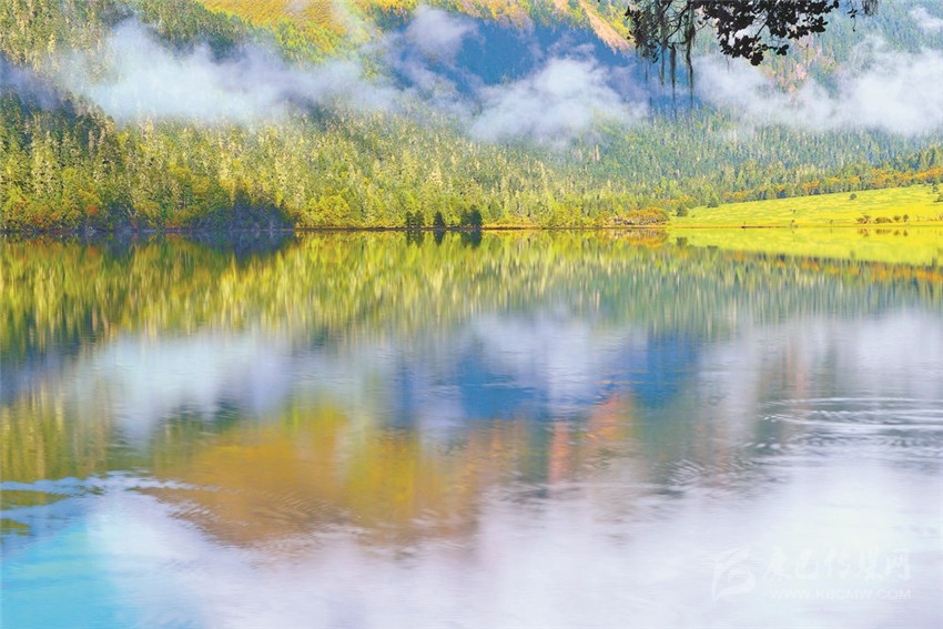 置身于雪山、湖色與草色,陽光精確地照在一棵金色的樹上,樹的光亮奪目與遠處云霧繚繞的暗山形成反差,如夢如醉。