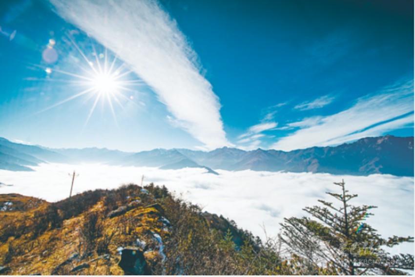 在阻隔灣壩通往外域的山脈中,有一個(gè)地方名為小卡子。一條簡(jiǎn)易的林區(qū)便道通往那里。從這條便道穿越峽谷的最陡處,越過(guò)林線的高度,最終將會(huì)馳上一條刀刃狀的山脊。脊的兩側(cè),西為著名的大雪山、貢嘎山,東為令牌山、則爾山。這條山脊的海拔在5000米左右,這是足以傲視群山的高度,而且恰恰又是云層頂端的高度。常常溝底陰云低罩,山腰云霧繚繞。到了山脊,天空頓時(shí)空闊遼遠(yuǎn),艷陽(yáng)高照,而山脊的兩側(cè),云海飄渺,宛若仙境。而遠(yuǎn)處的山巒大多又在云層之上,峰高云低,如孤島浮舟。