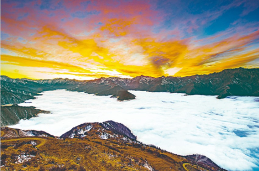 一條群山環(huán)繞的河谷,從衛(wèi)星圖上看,它就像一片樹(shù)葉,水系是莖脈,森林是葉的紋理,群山是齒狀起伏的葉緣。灣壩地區(qū)三面皆被海拔在4500米以上的高大山體環(huán)峙,僅南側(cè)有窄如細(xì)縫的峽谷通往外域,自然地理環(huán)境相對(duì)封閉原始,山谷風(fēng)作用就此產(chǎn)生。即當(dāng)太陽(yáng)出來(lái)后,山坡比谷底更早被加熱,山坡空氣受熱膨脹,密度變小,利于中午前后谷底的氣流補(bǔ)償進(jìn)來(lái),形成向上抬升,增加了上升動(dòng)力;加上云層的高度小于山頂?shù)母叨?,就形成了宏偉壯闊的云海景觀。灣壩云海是整個(gè)甘孜州規(guī)模最大的云海之一,也是最容易見(jiàn)到的云海,其云海規(guī)模達(dá)上萬(wàn)畝,基本全年都可見(jiàn),一年中最佳觀賞時(shí)間是春夏之際。