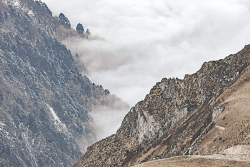 橫斷山主峰貢嘎山的西南坡,山勢(shì)陡峭,無(wú)數(shù)的錐狀山巒余峰,如刀林劍筍。雪山之下,溝谷縱橫,深邃不可測(cè),這是現(xiàn)代交通難以到達(dá)的地方,這些深幽的峽谷中,陽(yáng)光最難以照射的皺褶間,最易隱匿秘境。