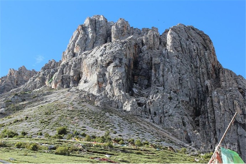 扎嘎神山又名為朗郎神山。神山山頂裸露,紅白相間的花崗石壘積形成數(shù)座山峰。主峰海拔4600米,如刀砌斧劈,險峻雄偉,直指云霄。傳說中文殊、金剛手、觀世音、法王松贊干布祖孫三代、蓮花生大師等眾多神靈曾經(jīng)蒞臨此山,留有許多圣跡,故名揚藏區(qū)。