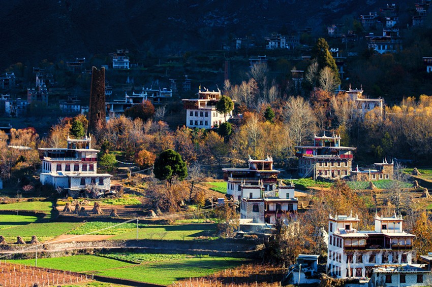 遠遠望去,一座座藏寨被色彩斑斕的彩林包圍之中,或稠密集中,或星落棋布,或在高山懸崖上,或在河壩綠茵間……伴著潺潺溪流,在緩緩升起的太陽照射下,隱在密林深處的寨房和農田形成一幅美輪美奐的畫卷,可謂是“人間天堂”。
