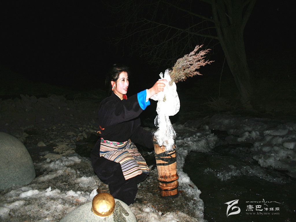 在除夕這天,家里的婦女會把庭院,房屋重新打掃一遍。把垃圾再清理一次。因?yàn)榱?xí)俗認(rèn)為,初一掃地和除垃圾會把一年的財(cái)運(yùn)和好運(yùn)都掃走。這天,大人小孩還要忙著洗頭、洗澡,搞好個人清潔衛(wèi)生。而除夕之夜最重要的一個儀式是“搶頭水”。(新年的第一桶水—晨星水)。傳說,晨星水是人間最吉祥的水。它可以獻(xiàn)神,可以潔身,可以祛病,洗滌一切污垢和不祥,帶來平安和幸福。從除夕夜十二時(shí)開始,一個個懷抱柏樹枝和哈達(dá)的姑娘或小伙子們披著繁星,爭先恐后地去背晨星水。第一個先到河邊的要熏燃桑煙,并用哈達(dá)繞上柏樹枝蘸水向空中拋灑三次,并把柏樹枝放在河邊。背回的晨星水首先要供奉佛祖。然后才可以用來燒茶、洗漱。而家里的五谷斗上則盛滿了糌粑、炒青稞粒、人參果等食品,上插青稞穗,也有在八寶碗里用糌粑和五彩酥油做成“切巴”,供奉在佛堂里。這一切都是為了祈禱來年風(fēng)調(diào)雨順、人畜兩旺、喜獲豐收。除夕夜,在正房桌子上還要擺上各式油炸果子、牛肉坨坨、糖果以及青稞美酒、飲料等等美味佳肴,開始迎接新年的到來。