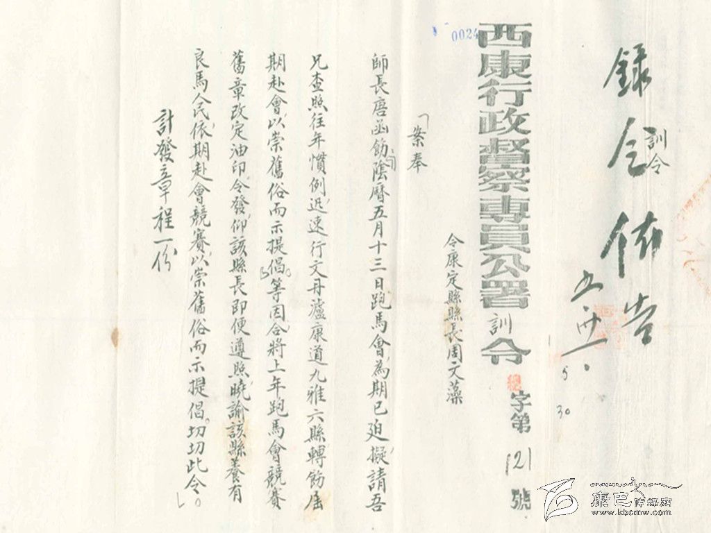 康定城各民族雜居,各種民族文化相融,形成了康定特有的民俗、風(fēng)俗。現(xiàn)在已經(jīng)不可能見到的“郭達將軍廟會”和每年“四月八轉(zhuǎn)山會”期間在康定城郊舉辦的“賽馬會”,這些屬于康定特有的民俗風(fēng)情,在民國時期曾經(jīng)盛況空前。舉辦“郭達將軍廟會”,警察要出來維持秩序。這份賽馬簡章特指1940年“四月八轉(zhuǎn)山會”時的一次賽馬。據(jù)《甘孜州志》記載:在1940年的5月,由于有“康定、瀘定、九龍、丹巴、道孚、乾寧”騎手參加賽馬活動,才制定了這份“新簡章”。