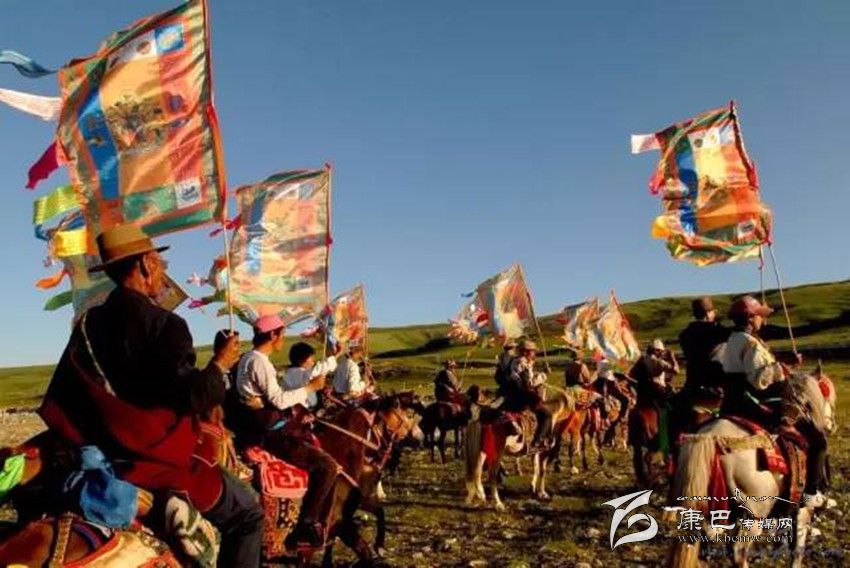 藏歷五月初四,就是色達(dá)牧民的祭神節(jié)。這天,牧民們在各色布上印上象征福氣的經(jīng)文,在經(jīng)旗周邊裝飾上白、紅、黃、綠、蘭布條。男子在自己的火槍槍架上,飾以經(jīng)幡,上邊掛一緞制煙祭用的小袋騎馬趕赴節(jié)日集會地點(diǎn)。