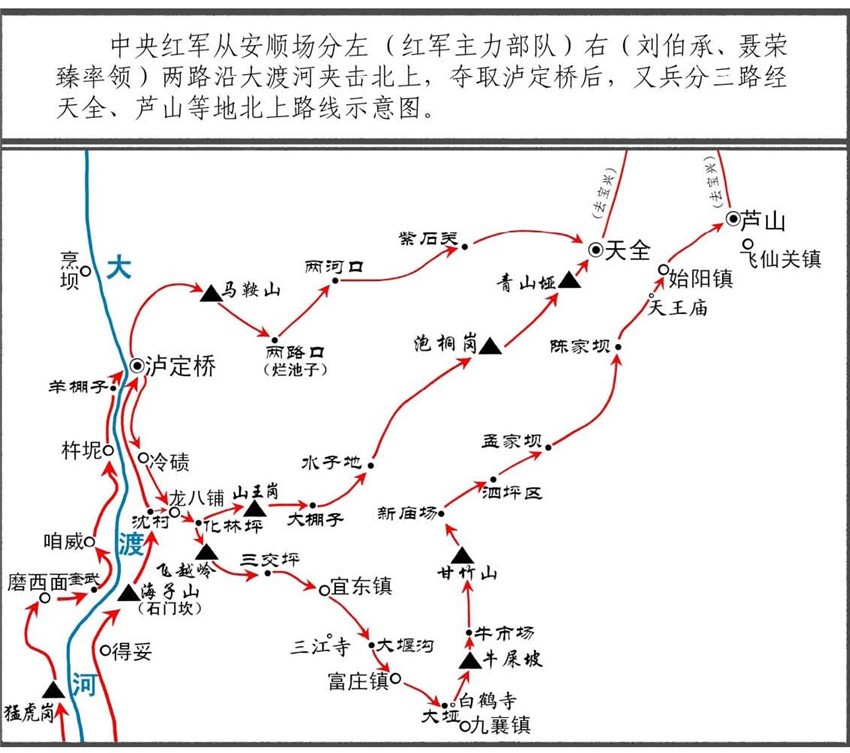 關(guān)于紅軍離開(kāi)瀘定后的具體行軍路線,聶榮臻同志后來(lái)曾經(jīng)回憶:“我全軍過(guò)大渡河后,開(kāi)始想回過(guò)頭來(lái),南向清溪、富林,以扼阻中央軍渡河北上,所以我們1軍團(tuán)又在化林坪等地?fù)魸⑼耸氐诙€的四川軍閥河防部隊(duì)。以后軍委得知清溪有川軍守?cái)乘膫€(gè)旅,為了避免與敵糾纏,盡快與四方面軍靠攏。又命令我們繼續(xù)北上去占領(lǐng)天全、蘆山?!?/span>5月31日,飛奪瀘定橋的紅2師4團(tuán)不顧連日行軍作戰(zhàn)的疲勞,從瀘定趕到飛越嶺下,攻打飛越嶺。飛越嶺位于瀘定縣東南,是漢源和瀘定的分界地,海拔近3000米。山頂有一隘口,稱為飛越關(guān)。此關(guān)是瀘定能往漢源、滎經(jīng)的道路,也是紅軍北上的必經(jīng)之地。6月1日清晨,紅軍發(fā)起對(duì)飛越關(guān)敵軍陣地的偷襲戰(zhàn),在付出30余人傷亡的代價(jià)后,成功占領(lǐng)了飛越關(guān)。