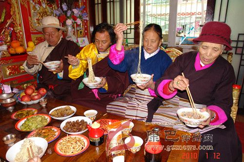 巴塘人一年當(dāng)中有很多重要的節(jié)日,而最重要的莫過于過春節(jié)。隨著農(nóng)歷新年的來臨,巴塘人過春節(jié)的氛圍也越來越濃烈了。掃塵、貼春聯(lián)、殺年豬、罐血腸、樹經(jīng)幡、獻(xiàn)“切瑪” 、曬牛肉干、做長面、炸“花茹” 、 釀青稞酒等等,人們臉上綻放出春天的笑顏,喜逐顏開迎候新春佳節(jié)的到來。而在眾多的風(fēng)味飲食中,炸“花茹” 、 吃長面(當(dāng)?shù)厝朔Q之為“金絲面”)是巴塘人春節(jié)時家筵中必不可缺的美食佳肴。