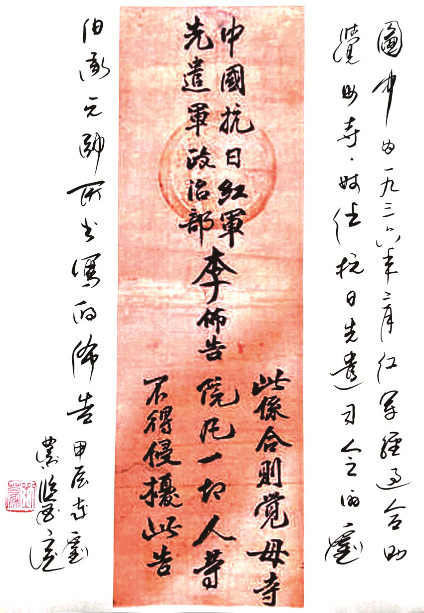 該布告和其他的布告在書(shū)寫(xiě)形式上有所區(qū)別,不是現(xiàn)在常見(jiàn)的橫向的,是豎向的,按照上中下分三部分,發(fā)布方、責(zé)任人、發(fā)布內(nèi)容。它的落款也就是發(fā)布方的單位在上面,左右對(duì)稱(chēng),蓋章可以辨認(rèn)為:中國(guó)工農(nóng)紅軍第四方面軍第三十軍政治部。中間是發(fā)布人李先念的姓李,比其他字大一倍,以示突出。在下方是布告的內(nèi)容。書(shū)寫(xiě)者以行書(shū)書(shū)寫(xiě),一氣呵成,整體結(jié)構(gòu)勻稱(chēng),字體大小適中,內(nèi)容簡(jiǎn)明扼要。布告歷經(jīng)多年,保存完好,說(shuō)明寺院的收藏者對(duì)布告的內(nèi)容認(rèn)可,對(duì)書(shū)寫(xiě)者書(shū)法充滿敬意。