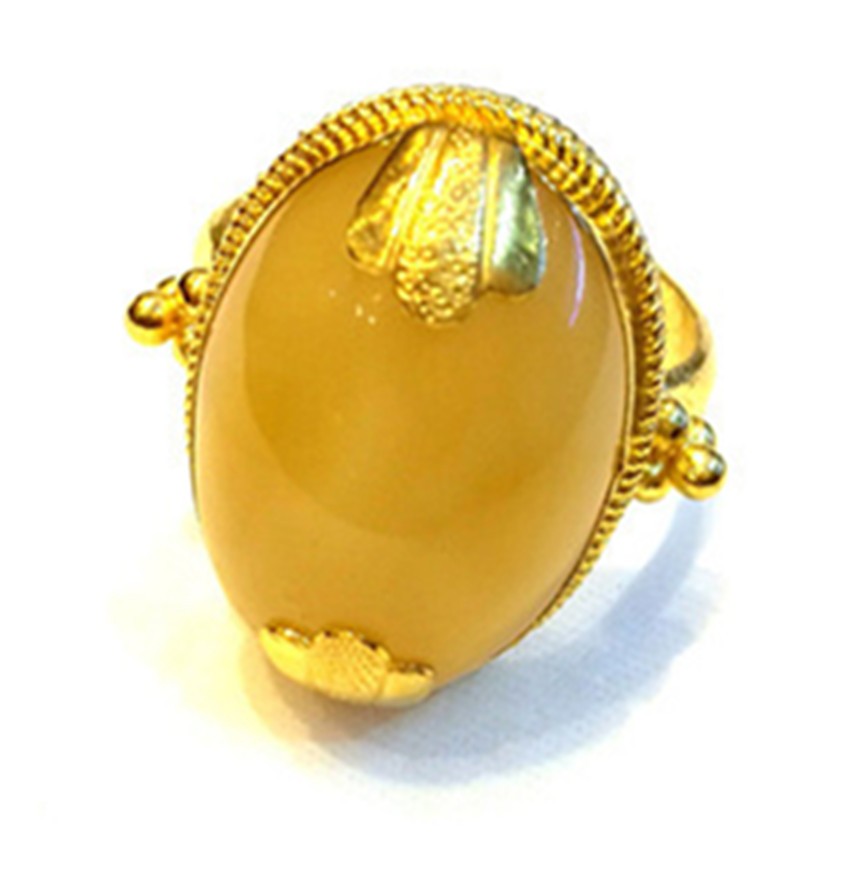 蜜蠟是藏家裝飾中的上成品,藏民族對(duì)蜜蠟的喜愛是非常誠(chéng)懇的,表達(dá)著他們對(duì)大自然的無限崇敬之情與大自然饋贈(zèng)的感謝之情。在他們看來,蜜蠟除了能夠作裝飾品佩戴、收藏之外,最引人注目的就是靈性修行之功效,設(shè)計(jì)師在此款戒指的設(shè)計(jì)上,緊扣藏民對(duì)蜜蠟的喜愛,并將漢式花邊與蜜蠟結(jié)合,是對(duì)藏漢文化交流較好的體現(xiàn)。