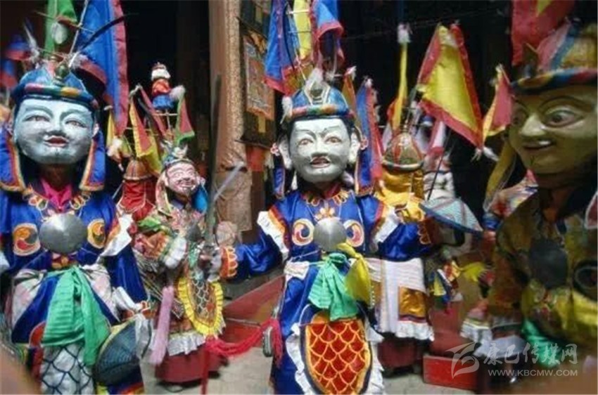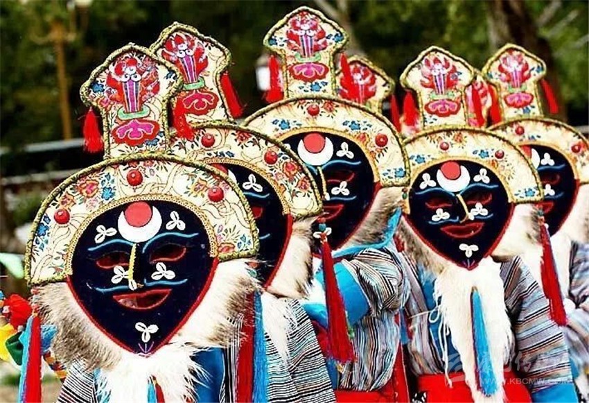第三部分,被稱為“扎西學(xué)”。頭戴白羊皮面具,面部呈黃色的演員們是吉祥老人的化身。他們雖然老態(tài)龍鐘,但動(dòng)作卻輕盈無比。其裝束除了腰間纏繞的“子體”未掛五色彩綢外,與“溫巴”別無二致。他們?cè)跉g樂的舞動(dòng),向眾人賜福吉祥。