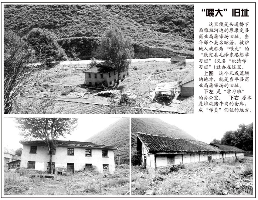 當(dāng)年康定縣搞“一批雙清”,特地選在雅拉河邊上康定縣商業(yè)局的屠宰場(chǎng)辦了個(gè)以“催肥”為目標(biāo)之一的“學(xué)習(xí)班”,其意就是要在這里將一些“不夠秤”的“5.16”“三老會(huì)”對(duì)象,“一批二斗”擠“材料”,像屠宰場(chǎng)催肥豬一樣“展”夠秤。所以爐城人將它戲稱為“喂大”。