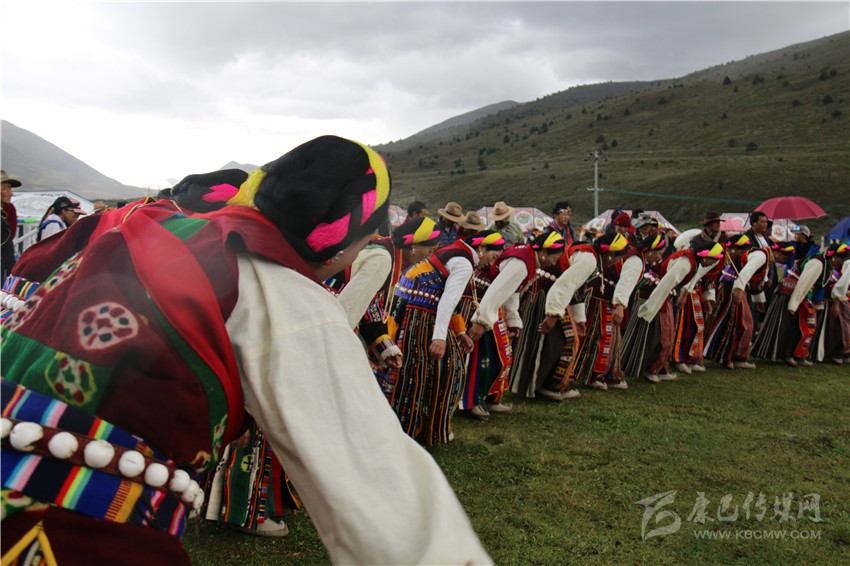 10月2日,在木雅鍋莊悠揚(yáng)的旋律和輕盈的舞步中,歷時(shí)兩天的“2017康定情歌國(guó)際音樂(lè)節(jié)”盛大開(kāi)幕,作為“五大民俗展演”中的特色民俗歌舞表演部分,木雅鍋莊吸引了眾多游客的關(guān)注。木雅鍋莊來(lái)源于木雅人的日常生產(chǎn)和生活,是當(dāng)?shù)剞r(nóng)耕文化習(xí)俗的重要表現(xiàn),表演服飾多以棕紅色外套,紅、白色襯衫為主,表演者多佩戴紅頭繩、珊瑚、金銀等裝飾物。舞蹈分男女兩組,列隊(duì)圍桌成圓形,皆彎腰垂首隨領(lǐng)唱歌聲而舞。男組舞姿氣勢(shì)豪放,女組舞姿委婉優(yōu)雅。唱腔宛轉(zhuǎn)悠揚(yáng),吸引了在場(chǎng)觀眾冒雨駐足觀看,有的甚至情不自禁隨著舞群踏起了舞步,融入到康巴文化的神秘魅力當(dāng)中。