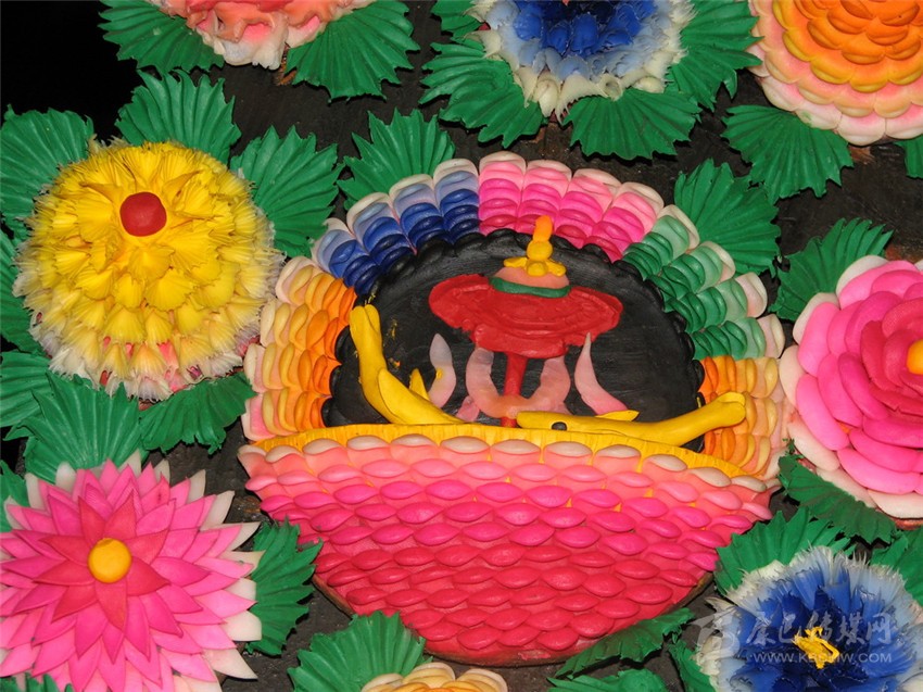 制作酥油花先是“扎骨架”根據(jù)所表現(xiàn)的內(nèi)容,用加工的柔軟草束、麻繩、竹竿、棍子等物扎成大大小小不同形態(tài)的“骨架”,即所塑造的基本模型。其次是“做胚胎”,塑造的第一道原料是用上年拆下來的陳舊酥油花摻和上草木灰反復(fù)捶打,制成韌性好彈性強的黑色塑造油泥。然后裹在骨架上完成粗糙但準確的一個個大造型,其塑法近似面塑或泥塑。再次是“敷塑”,塑造的第二道原料是在加工成膏狀的乳白色酥油中揉進各色礦物質(zhì)顏料,調(diào)和成五顏六色的油塑原料,仔細的涂塑在做好的形體上,有的還要用金、銀粉勾勒,完成各色形象的塑造。要是塑造紅花綠葉,或是玲瓏剔透的玉石寶玩,則直接用彩色油料一次塑成。為了防止塑制中因手的溫度而使酥油胚料融化變形,藝僧們在室溫控制在零度的作坊里,身邊放有一個盛有冰塊的水盆,他們要不時將手浸入冰水中。整個制作過程十分艱辛,藝僧們的手上大多會生出凍瘡。對佛教的虔誠和對藝術(shù)至美的追求,完全超越了肉體上的痛苦,冰冷的手中,艷麗的酥油花不斷生成。最后酥油花一道工序是“裝盤”,將塑好的酥油花按設(shè)計的總圖要求,用鐵絲一一安裝到位,固定在幾塊大木板上或特制的盆內(nèi),高低錯落有致,件件立體懸空,觀賞者可以從不同的角度觀瞻玩味。布局成單一的花卉圖案或整幅的故事畫面,俗稱“酥油花架”,展出時,“酥油花架”會用高桿立起,最高可達十幾米,人們在下以仰視角度觀看,更覺佛法莊嚴,寶像生輝。一座大的花架上,往往要塑造幾十個、甚至一二百個人物組成的故事畫面。其中菩薩金剛端坐安詳,飛天仙女身姿綽約,花鳥蟲魚栩栩如生,人物神形兼?zhèn)?,亭臺樓閣金碧輝煌,整個畫面繁而不亂,絢麗多彩,令人嘆為觀止。
