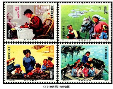 “燃燒自己,照亮別人”,是每一位教書人的精神寫照。在我國發(fā)行的郵票中就常常出現(xiàn)那些工作在基層的普通教師的忙碌身影。1959年9月25日,我國發(fā)行《人民公社》特種郵票,其中第5枚“學(xué)”,圖案是一位手執(zhí)課本神情專注地在課堂上教學(xué)的老師。這是我國郵票中首次出現(xiàn)教師形象。1966年5月10日,我國發(fā)行《服務(wù)行業(yè)中的婦女》特種郵票,其中第4枚“保育員”,是反映我國幼兒教師工作情景的一枚郵票。1976年2月20日,我國發(fā)行《勝利完成第四個五年計(jì)劃》紀(jì)念郵票,其中第13枚“牧區(qū)小學(xué)”,圖案是一位藏族女教師在寬敞明亮的教室里授課的情景,反映了新中國成立后,特別是第四個五年計(jì)劃期間,我國少數(shù)民族地區(qū)飛速發(fā)展的教育事業(yè)。1975年3月8日,我國發(fā)行《鄉(xiāng)村女教師》特種郵票,全套4枚,圖案分別是“認(rèn)真看書學(xué)習(xí)”“巡回教學(xué)”“開門辦學(xué)”和“水上小學(xué)”。全套郵票是工作在廣大農(nóng)村的中小學(xué)教育工作者在辦學(xué)條件艱苦的情況下仍然堅(jiān)持認(rèn)真學(xué)習(xí)、勤奮工作、忠于黨的教育事業(yè)的真實(shí)寫照。