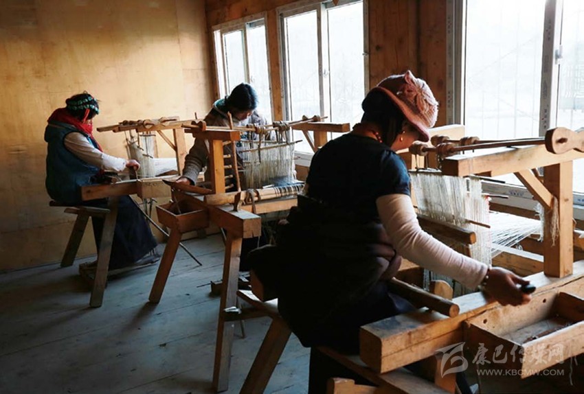 2003年,“編織班”邀請(qǐng)澤巴姆為老師,將這項(xiàng)技藝傳承了下來?,F(xiàn)在,澤巴姆年紀(jì)大了,牛羊毛絨編織這樣繁復(fù)又耗體力的事情她不再做了,全交給了自己的媳婦扎西巴姆——當(dāng)?shù)匚ㄒ坏呐Q蚪q編織老師。第二天,我們?cè)诰幙棸嗟墓し焕镆姷搅嗽靼湍?。工坊一角的木架上擺著為數(shù)不多的圍巾、墊毯等產(chǎn)品,窗邊平行擺著六臺(tái)織機(jī),扎西巴姆正帶著幾個(gè)藏族婦女坐在其間飛梭走線。陽光從窗戶透進(jìn)來,投射在織機(jī)和織女們身上,古老的場(chǎng)景、緩慢的節(jié)奏恍惚把我?guī)Щ亓俗婺傅臅r(shí)代。扎西巴姆說,當(dāng)?shù)厝朔Q牦牛絨為