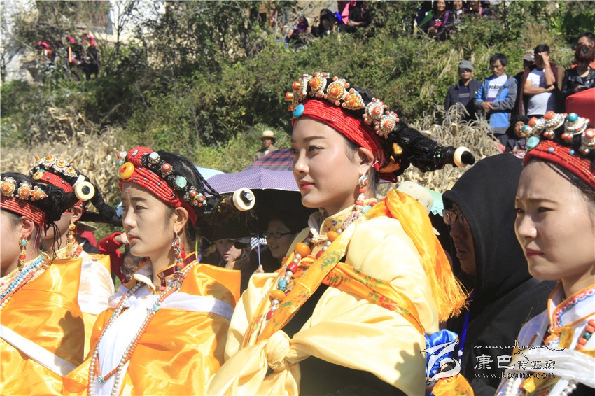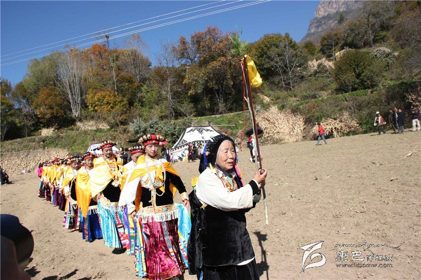 所有的祈福儀式結(jié)束后,村子里一位德高望重的長輩走上圓臺(tái),用雄渾有力的嗓音向場地外等候的人們發(fā)出指令。在一段念詞結(jié)束之后,參加成人儀式女孩們的父親們在一位老人的指引下緩緩的向場地中央走來,老人手舉一幅一米高的唐卡畫,口中念念有詞,走在他后面的父親們一襲白色的毪衫,頭戴一頂灰色的禮帽,腳穿紅黑相間的藏靴,頸上掛著一根潔白的哈達(dá),滿臉肅然的緊隨老人之后,來到月形的臺(tái)子邊,站成一個(gè)半圓形。當(dāng)父親隊(duì)站定后,母親隊(duì)們也向場地中移步而來,本次成人儀式的主角們在一位老阿媽的帶領(lǐng)下向場地中走來,每一位女孩穿著打扮都是那么的光鮮靚麗,每一個(gè)人都顯得美麗動(dòng)人,她們披著黃色的披風(fēng),一根白色的哈達(dá)在胸前打著結(jié),五顏六色的哈達(dá)懸掛在這根哈達(dá)上,在姑娘們的后背迎風(fēng)飄飛。走到圓臺(tái)邊,小女孩們也圍成半圓,低著頭,等待著喇嘛們的念經(jīng)祈福和家人的祈福。此時(shí),兩位吉祥老人站了起來,手中拿著凈瓶,走到姑娘們面前,一邊念誦經(jīng)文,一邊將手中凈瓶里的水倒在姑娘們的手心里,姑娘們則虔誠的將這圣水輕輕的抹在自己的額頭上,寓意吉祥如意。待喇嘛主持儀式結(jié)束后,主持儀式的老人用嘉絨語向蒼天和墨爾多神山祈禱,希望神賜予孩子們美麗的面容和美好的心靈,從今日起,她們就可以真正的長大成人了。吉祥詞念誦完后,母親們排著長長的隊(duì)伍緩緩來到孩子們的面前,將懸掛在胸前的哈達(dá)取下,久久的凝視著女兒的臉,眼角掛著幸福的淚水,用顫抖的聲音為女兒祈福,叮囑孩子們要孝敬父母,做一個(gè)正直善良的人,然后,才將白色的哈達(dá)掛在女兒的頸上,父親們則站在原地,看著母親們將哈達(dá)和祝福送給女兒,見證著女兒們的長大成人。接受完父母和長輩們的祝福之后,盛大的鍋莊舞會(huì)開始了。小女孩們也跟隨著這些舞者們手牽著手走到場地中央,跳起歡快的鍋莊舞。擁忠大娘說,成年禮上的鍋莊舞會(huì)一般都要視參加成人禮儀式女孩們親戚多寡而定,每一名長輩都會(huì)走到場地中牽頭,跳起舞蹈,這時(shí)候是女孩的長輩們炫耀舞技和歌聲的時(shí)候,他們矯健的舞步和甜美的歌喉迎來眾人的和鳴。