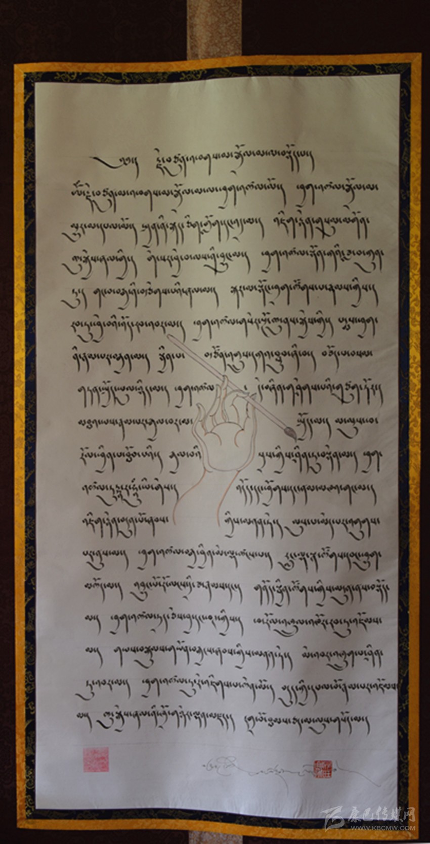 昂旺曲批的書(shū)法傳承頗有一些淵源。歷史上,德格土司曾請(qǐng)來(lái)全藏區(qū)頂尖藏文書(shū)法大師,后取眾人不同風(fēng)格字體,共同構(gòu)成了頗具多元審美風(fēng)格的“德珍”派書(shū)法。1988年,昂旺曲批就讀省藏校,在德格籍書(shū)法教師巴登處傳承了這一藏文書(shū)法。