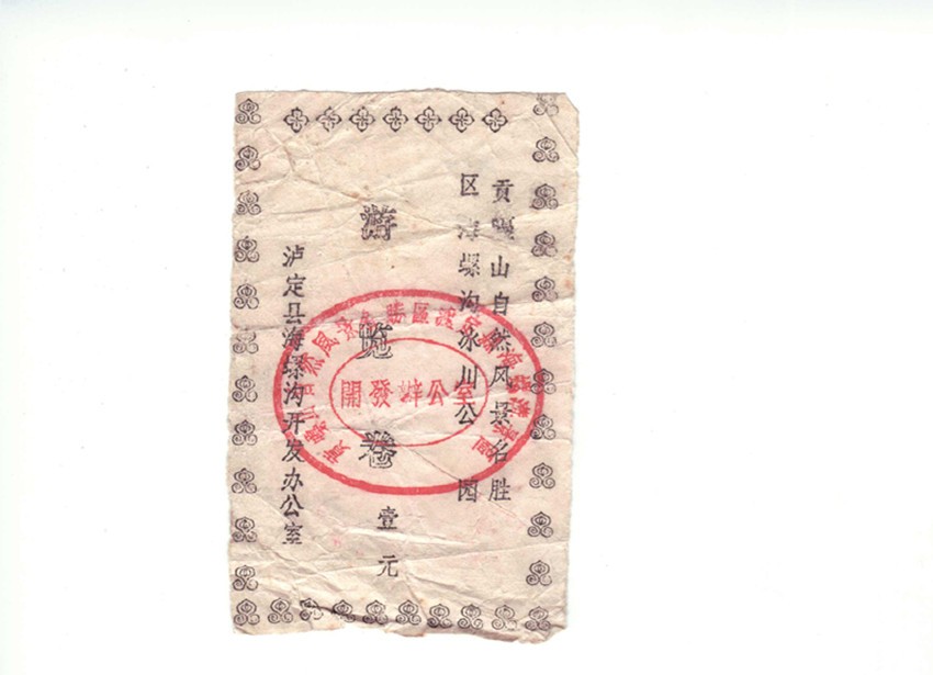 我有心收藏海螺溝旅游開發(fā)建設(shè)三十年來(lái)不同時(shí)期、品相各異的門卷、門票數(shù)枚。門卷、門票是游客進(jìn)入景區(qū)的憑證,也是景區(qū)的“臉面”。在我收藏的門卷、門票中有一枚海螺溝景區(qū)第一代門卷。構(gòu)圖簡(jiǎn)單,白底黑字的第一代門卷,雖然在歲月中褪去了鮮色,但在方寸之間卻承載著海螺溝景區(qū)建設(shè)最初的時(shí)光和開發(fā)建設(shè)者的記憶,更是瀘定縣三十年前發(fā)展旅游的歷史見證。一晃三十年光陰,至今我對(duì)海螺溝景區(qū)第一代門卷的來(lái)歷,還記憶猶新。