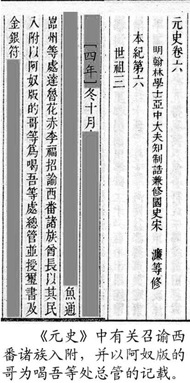 今屬康定縣的木雅,又分為上木雅和下木雅。下木雅的色烏絨地方,是木雅王曾住過(guò)的地方之一。民間又稱住在這里的王為“西吳甲布”(即“西吳王”),進(jìn)而又附會(huì)出個(gè)“西吳國(guó)”來(lái)。從木雅貢嘎西邊那條叫色烏絨的山溝往南到打箭爐,正如傳說(shuō)的那樣,早年一般要走三天?!对贰酚小昂任帷钡挠涊d,“喝吾”“色烏”都是藏語(yǔ)的音譯,藏語(yǔ)“絨”為山溝之意,指的就是這個(gè)色烏絨。元世祖忽必烈征滇,沿大渡河、金沙江而進(jìn),得到沿途部落首領(lǐng)的大力支持。長(zhǎng)河(大渡河)西的“西吳王”自然也不例外。所以在至元四年(公元1267年)“冬十月壬戌,魚通巖州等到處達(dá)魯花赤李福,招諭西番諸族酋長(zhǎng)以其民入附,以阿奴版的哥等為喝吾等處總管,并授璽書及金銀符?!钡玫缴w有皇帝大?。ㄓ癍t)文書和金銀符,朝廷正式任命為“喝吾”總管的酋長(zhǎng)(木雅王)阿奴版的哥,之后從色烏絨遷到打煎爐,不僅成為朝廷認(rèn)可的“長(zhǎng)河西土官”,還作了“四川分省右丞”。我們是否可以判定,“木雅王”遷爐的時(shí)間應(yīng)在至元四年(公元1267年)之后?1267年距今740多年,以此推算,如前文所說(shuō):今天西爐(康定城)的歷史,大約為700年!再者,若從宋代的“卡拉國(guó)”算起,說(shuō)“明正”歷四十二代,不能說(shuō)沒(méi)有一點(diǎn)來(lái)頭。