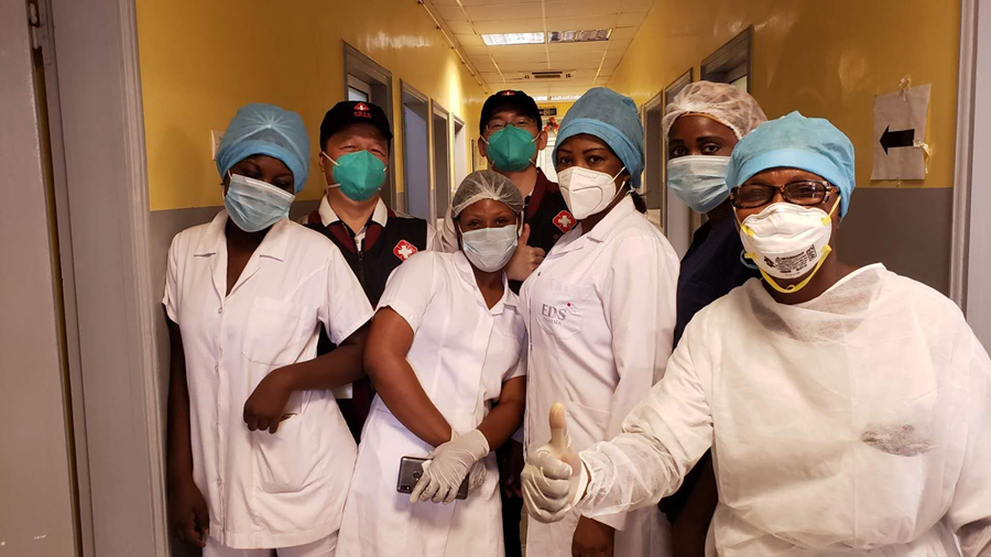 ??2020年5月26日,中國抗疫醫(yī)療專家組在剛果(布)首都布拉柴維爾指導(dǎo)新冠肺炎病房建設(shè)時,與當?shù)匾痪€醫(yī)務(wù)人員合影。新華社發(fā)