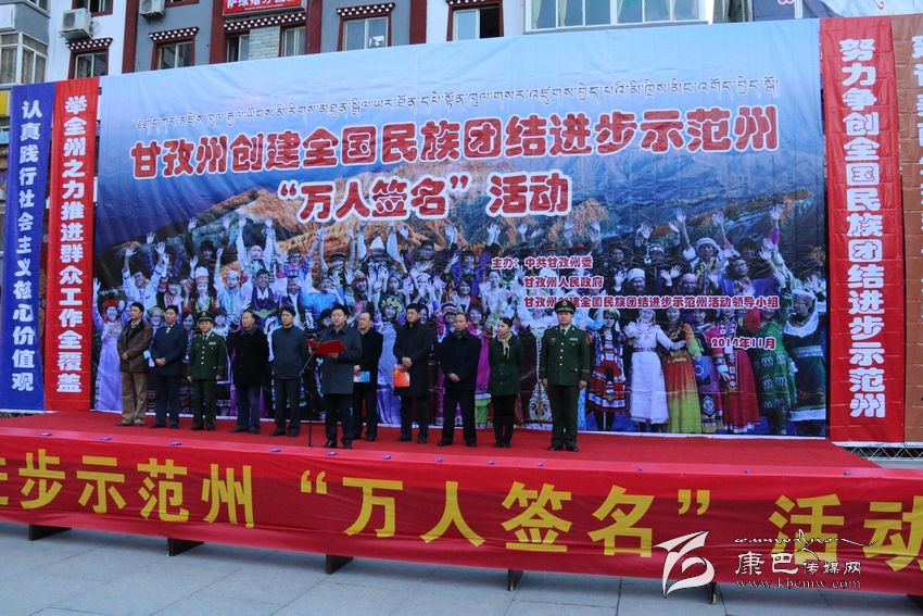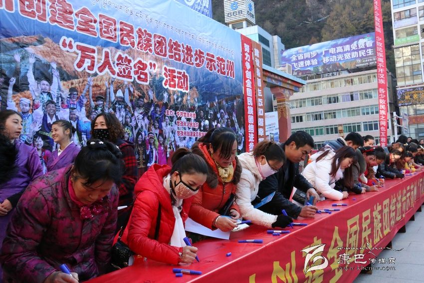 州人大常委會副主任李致民宣布創(chuàng)建全國民族團(tuán)結(jié)進(jìn)步示范州“萬人簽名”活動正式開始后,州領(lǐng)導(dǎo)汪洋、李致民、楊國元、范文華、蔣秀英、楊學(xué)康以及甘孜軍分區(qū)、駐州武警部隊領(lǐng)導(dǎo)同州級機(jī)關(guān)、志愿者、個體工商戶、學(xué)生、駐軍、政法干警、康定縣黨政機(jī)關(guān)干部代表近千人,陸續(xù)到“萬人簽名”條幅上簽下了自己的姓名。