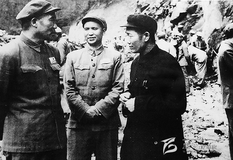 1953年秋,西南軍區(qū)副司令員李達(dá)代表賀龍司令員慰問川藏公路筑路部隊和職工,這是陳明義(中)陪同李達(dá)(左)在波密視察公路進(jìn)展情況。 (資料圖片)