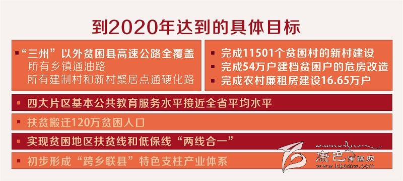 方案提出,到2020年“三州”以外貧困縣高速公路全覆蓋,所有鄉(xiāng)鎮(zhèn)通油路、所有建制村和新村聚居點通硬化路;完成11501個貧困村的新村建設(shè),全面完成54萬戶建檔貧困戶的危房改造,完成農(nóng)村廉租房建設(shè)16.65萬戶;四大片區(qū)基本公共教育服務(wù)水平接近全省平均水平;扶貧搬遷120萬貧困人口;實現(xiàn)貧困地區(qū)扶貧線和低保線“兩線合一”;初步形成“跨鄉(xiāng)聯(lián)縣”特色支柱產(chǎn)業(yè)體系等多項具體目標(biāo)。最終,確保省委提出的497.65萬農(nóng)村貧困人口全部脫貧、11501個貧困村和88個貧困縣全部“摘帽”,貧困縣農(nóng)民人均純收入比2010年翻一番以上,實現(xiàn)基本公共服務(wù)均等化、社會保障全覆蓋的目標(biāo)全面實現(xiàn)。
