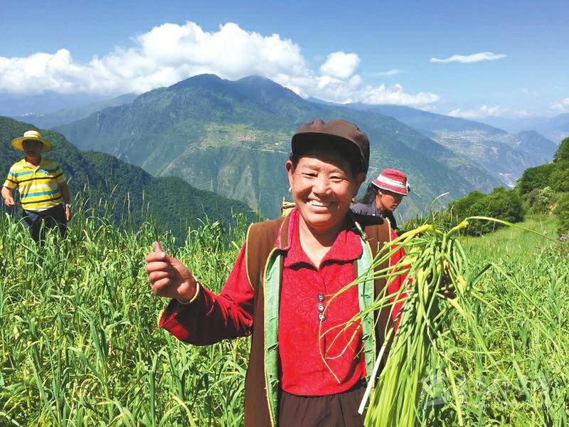 彭州市引入彭州蔬菜協(xié)會、彭州萱源農(nóng)業(yè)有限公司在黑水縣雙溜索鄉(xiāng)俄瓜村建設100畝大蒜標準化種植基地。圖為貧困群眾采收蒜薹。