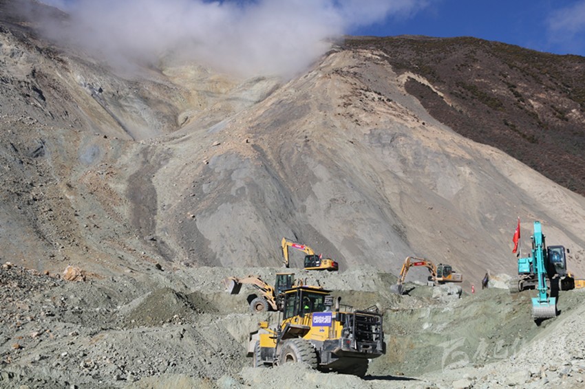 11月7日,又有7臺(tái)挖掘機(jī)抵達(dá)則巴村。當(dāng)天中午,道路開辟工作開始全面推進(jìn)。人輪班機(jī)器不休息,經(jīng)過半天一夜的不間斷施工,終于在8日8時(shí)過將通往江邊的7.5公里通道打通。挖掘機(jī)繼續(xù)沿著相對(duì)平坦的河床向上,開辟通往堰塞體壩頂?shù)牡缆贰?日下午2時(shí)28分,來(lái)自水電五局的挖機(jī)手趙明喜將第一臺(tái)挖掘機(jī)成功開上壩頂,比預(yù)計(jì)時(shí)間提前18個(gè)小時(shí)?!斑@個(gè)時(shí)間點(diǎn)我記得很清楚,這提前的18個(gè)小時(shí)給后續(xù)搶險(xiǎn)救援騰出了寶貴的時(shí)間?!笔?yīng)急管理廳副廳長(zhǎng)毛德忠說(shuō)。