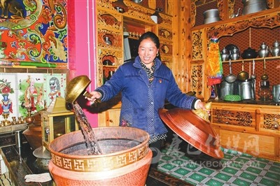 寬敞的院壩,卵石鋪就的花臺花開爭艷,獨立的衛(wèi)生間和廚房里,現(xiàn)代廚衛(wèi)一樣不缺,三個冰柜擺滿了食品,燒烤爐擺在廚房一角。走進頂真的客廳,55吋的液晶電視,造型典雅別致的碗柜,琳瑯滿目的各式器皿,藏桌上擺滿了水果和飲料。坐在“豪華”的客廳里,頂真幸福開懷。